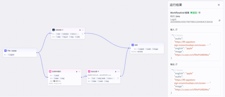 工作流的输入是一个英语单词,然后分成两个主要的分支,一个是把单词生成发音,另一个是根据单词生成图片内容。最后输出的结果是个json结构,包含单词、发音、图片。