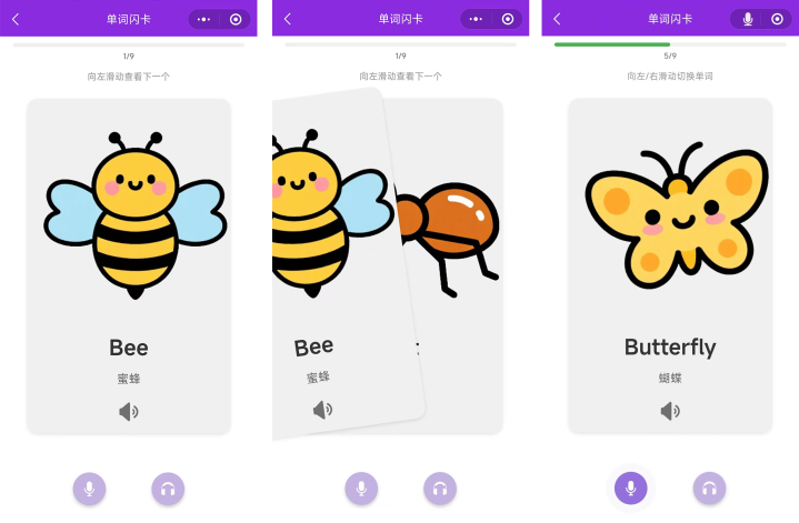 左右滑动图片可以切换单词闪卡。这个左右滑动的效果,滑动时图片倾斜的角度,以及滑动的位置,渐变的消失位置,我是尝试写了好几次提示词,最终才实现的。感兴趣的可以看首图有小程序码体验一下。在写提示词的时候,要想用AI来实现好的效果,必须要有一些做产品的知识,否则你都不知道该怎么表达你的意图。