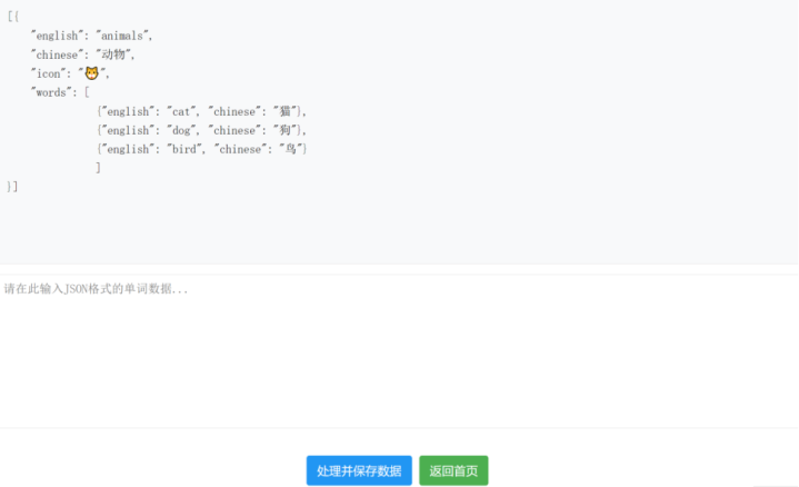 “批量导入”功能。把这个json示例扔给Deepseek,或者其他AI工具,让他生成类似的json格式。然后把生成的json数据,放入到输入框中,点击“处理数据”按钮就可以批量生成对应的主题和单词。