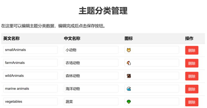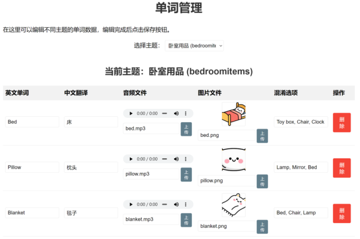 “管理单词”页面。这些单词都是coze批量生成的,如果对哪个单词的图片不满意,可以自己再单独生成更合适的图片。