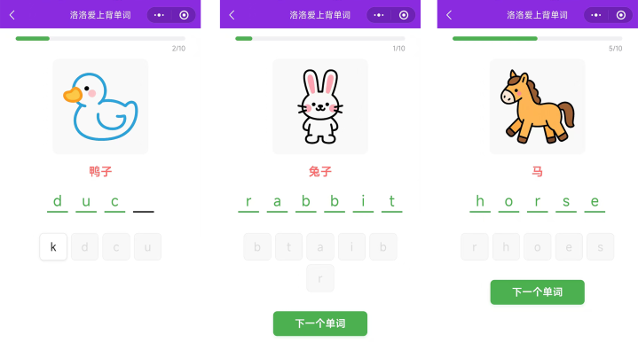 单词图片下面是打乱的字母排序,按单词正确顺序点击字母,选错字母的话,当前位置的横线会闪动变红色,拼写成功后会显示“下一题”的按钮。这里有个小问题,当单词比较长的时候,字母选项就多,看着有点乱,应该是当字母特别长的时候,默认已经填写了几个字母,这样看起来会比较好一些。